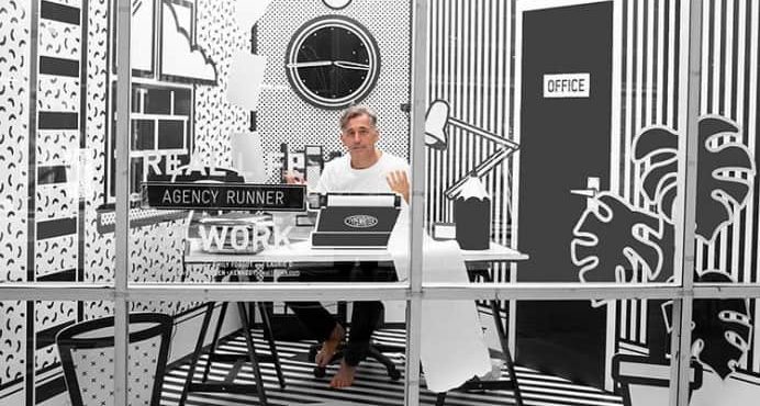 Hello Neighbour is one such resource. Through the program, W + K’s London office works with local artists to design its storefront windows. Its most recent installation, titled Real Life at Work, concluded last weekend. W + K’s employees took turns occupying a comic book–like office space, created by graphic artist Emily Forgot. Inspired by pop art painter Roy Lichtenstein, the temporary black-and-white printed façade served as the backdrop for W + K employees to show the outside world the way they work.