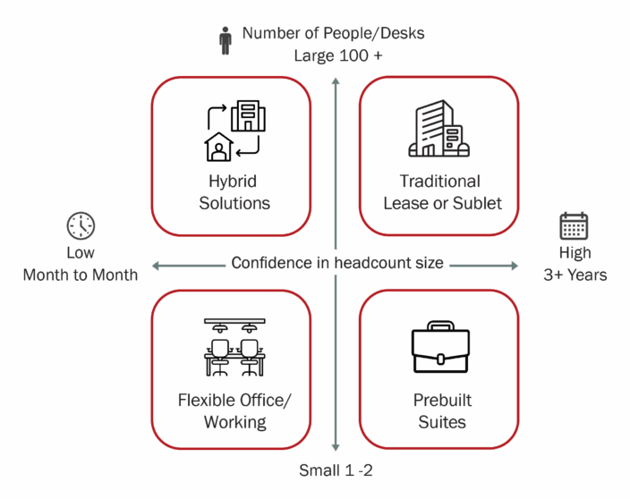When weighing office space options, take into account the size of your team, how they use the space and your confidence level in maintaining those exact requirements in the near future. The less confidence you have, the more flexibility you are going to require.
