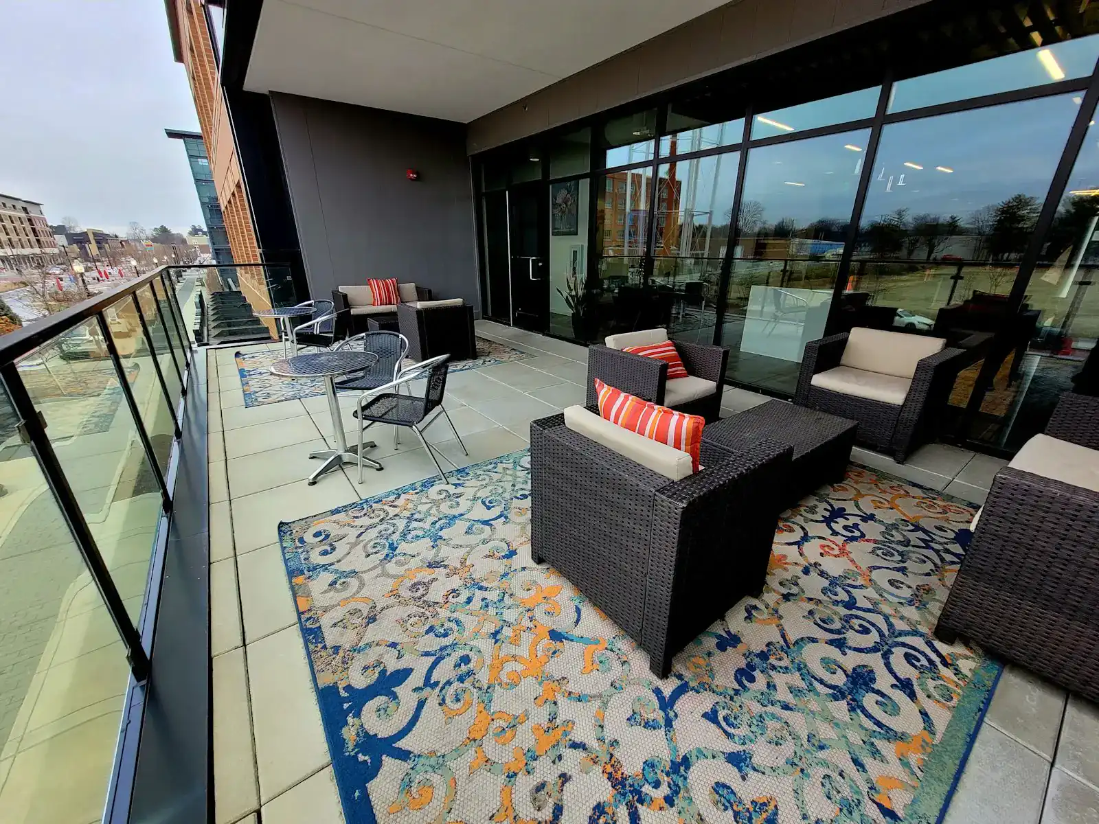 Balcony with outdoor seating overlooking the 18 mile Monon Trail, and steps from a dedicated outdoor recreation area featuring ping pong and shuffle board court